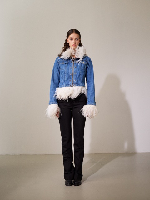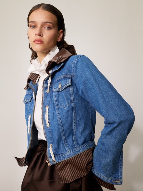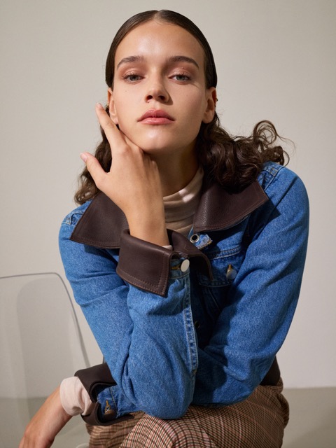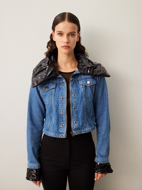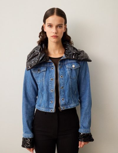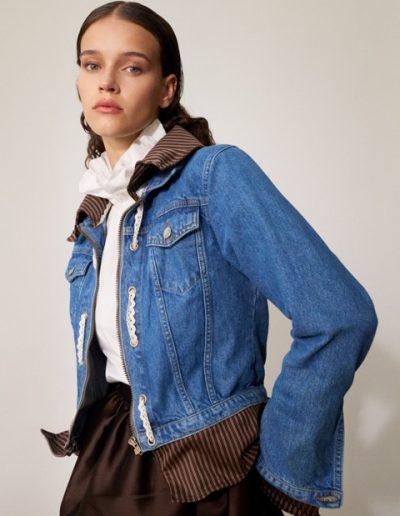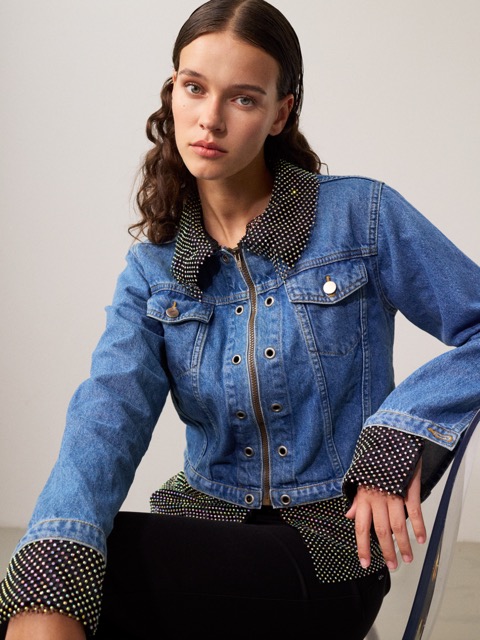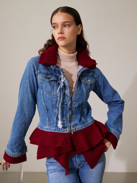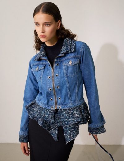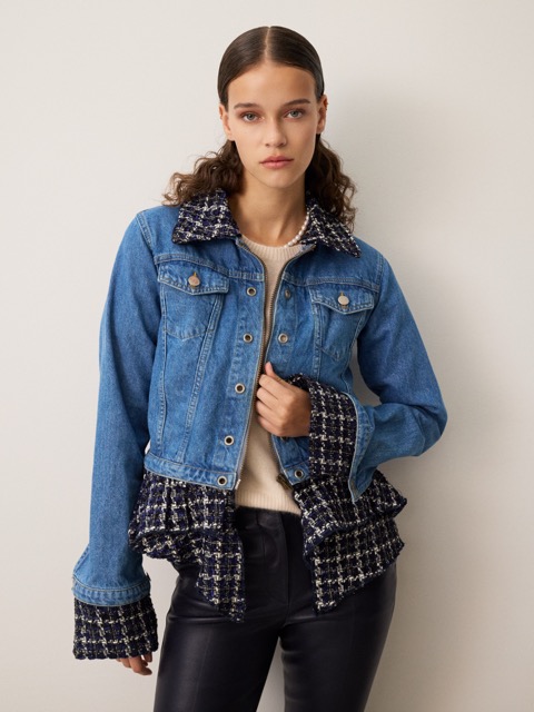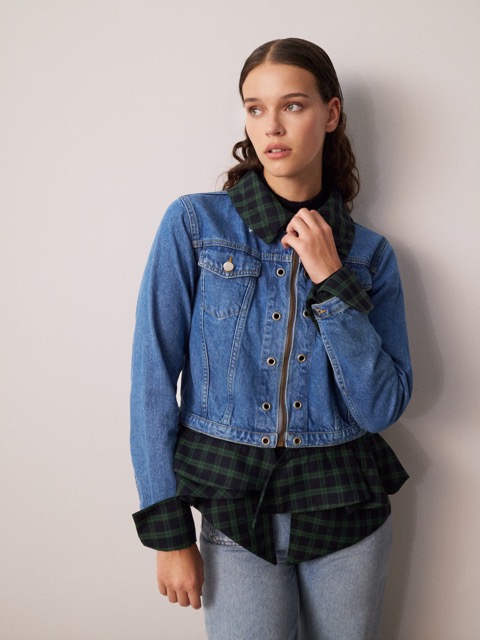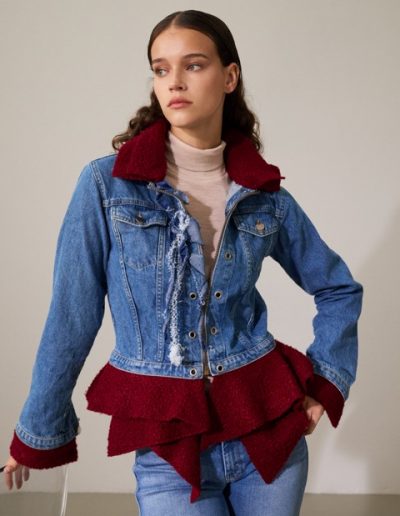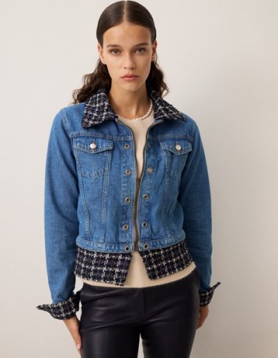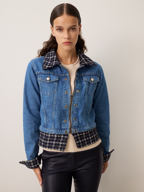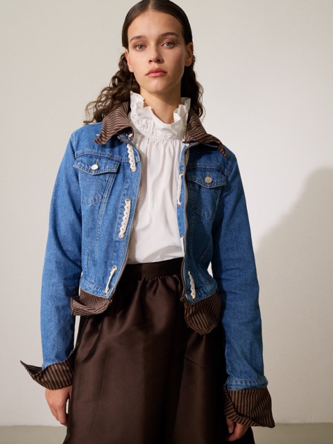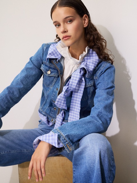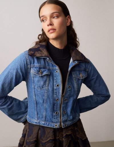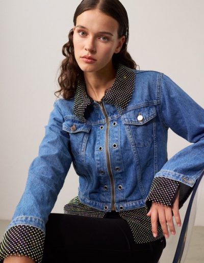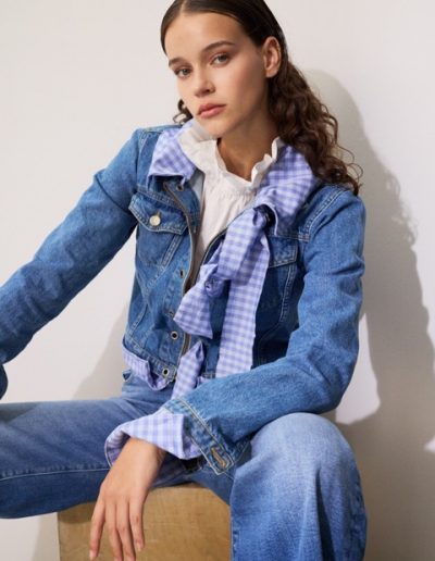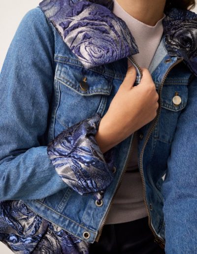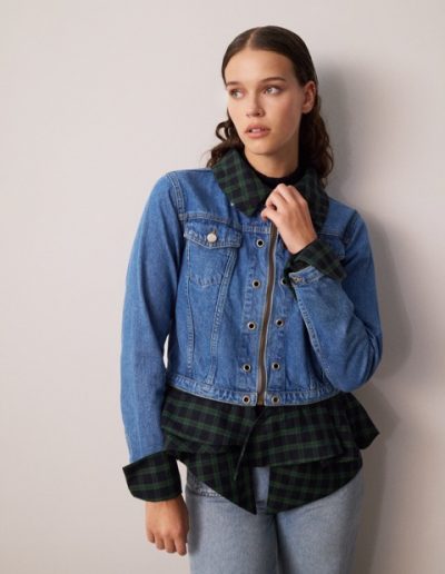 Ein blau-weiß kariertes Baumwoll-Design und ein edles Samt-Design (wählbar in blauschwarz, rot oder weiß). Jedes Add-on besteht aus Kragen, Bündchen Ärmel und Bündchen am unteren Bund der Basis-Jeansjacke.